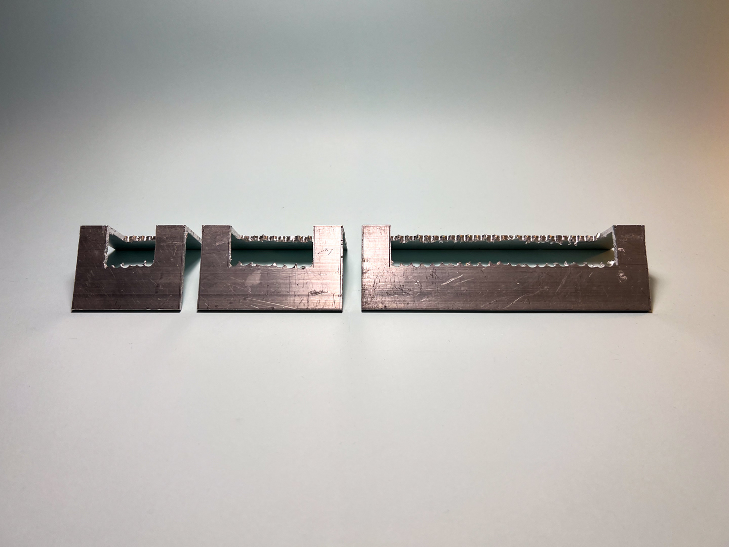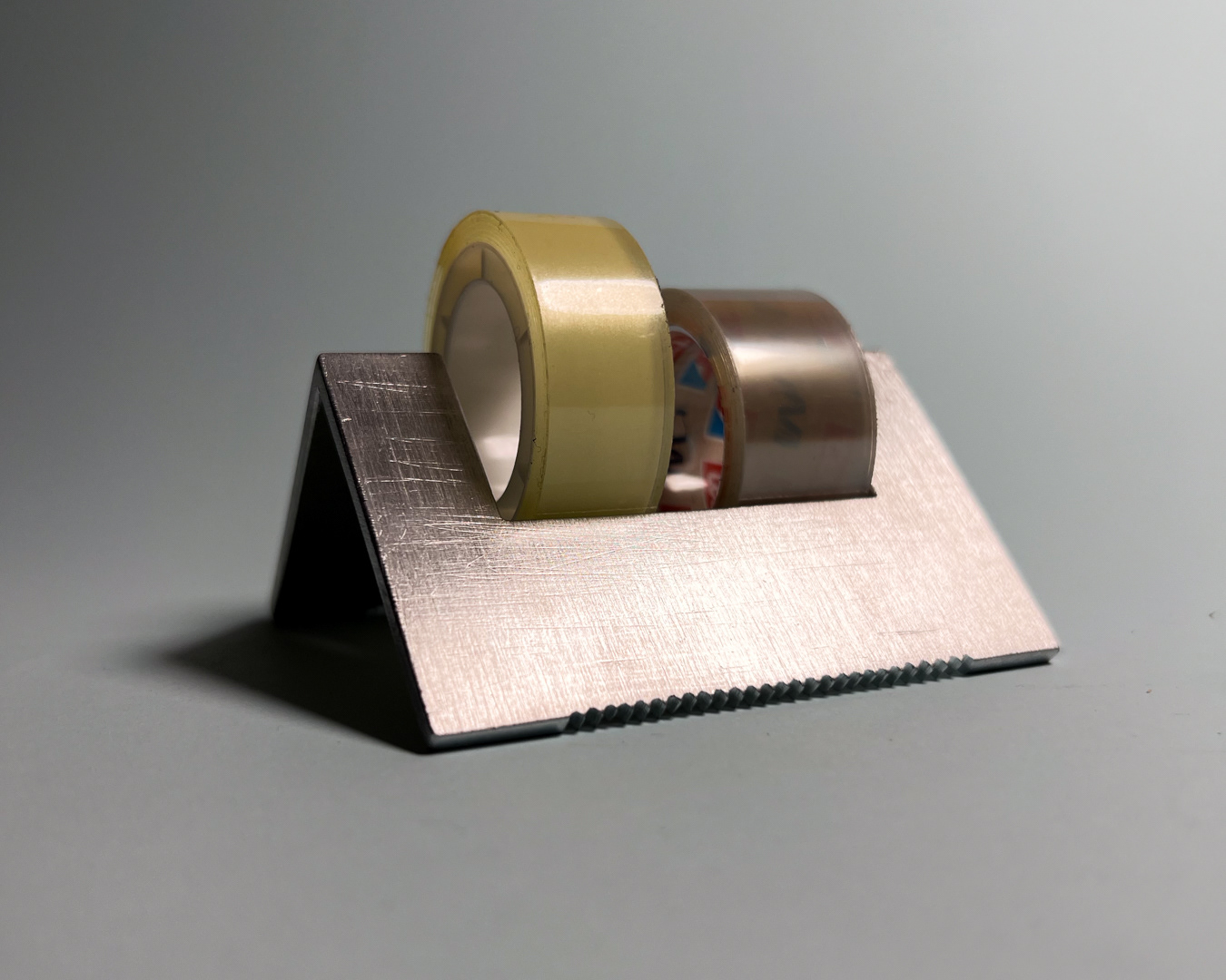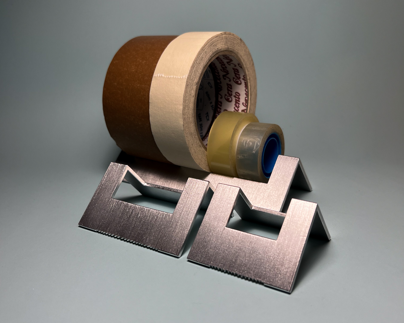 One aluminium bar generates three pieces: two tape dispensers for different widths and a larger element for unused rolls.