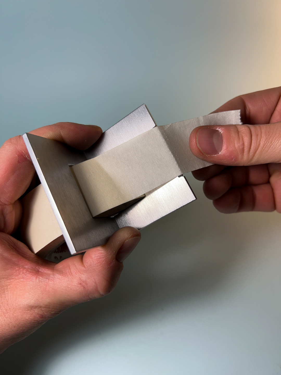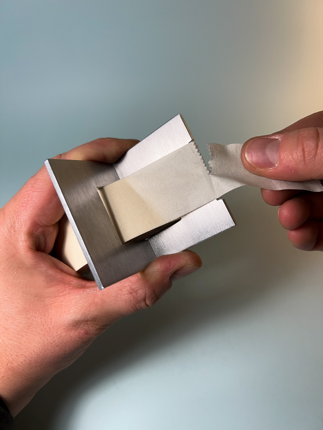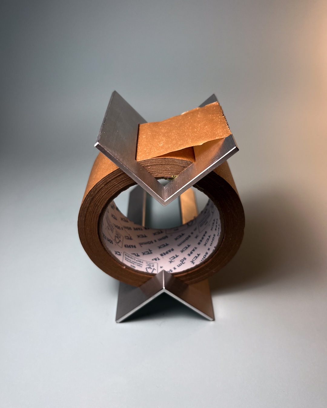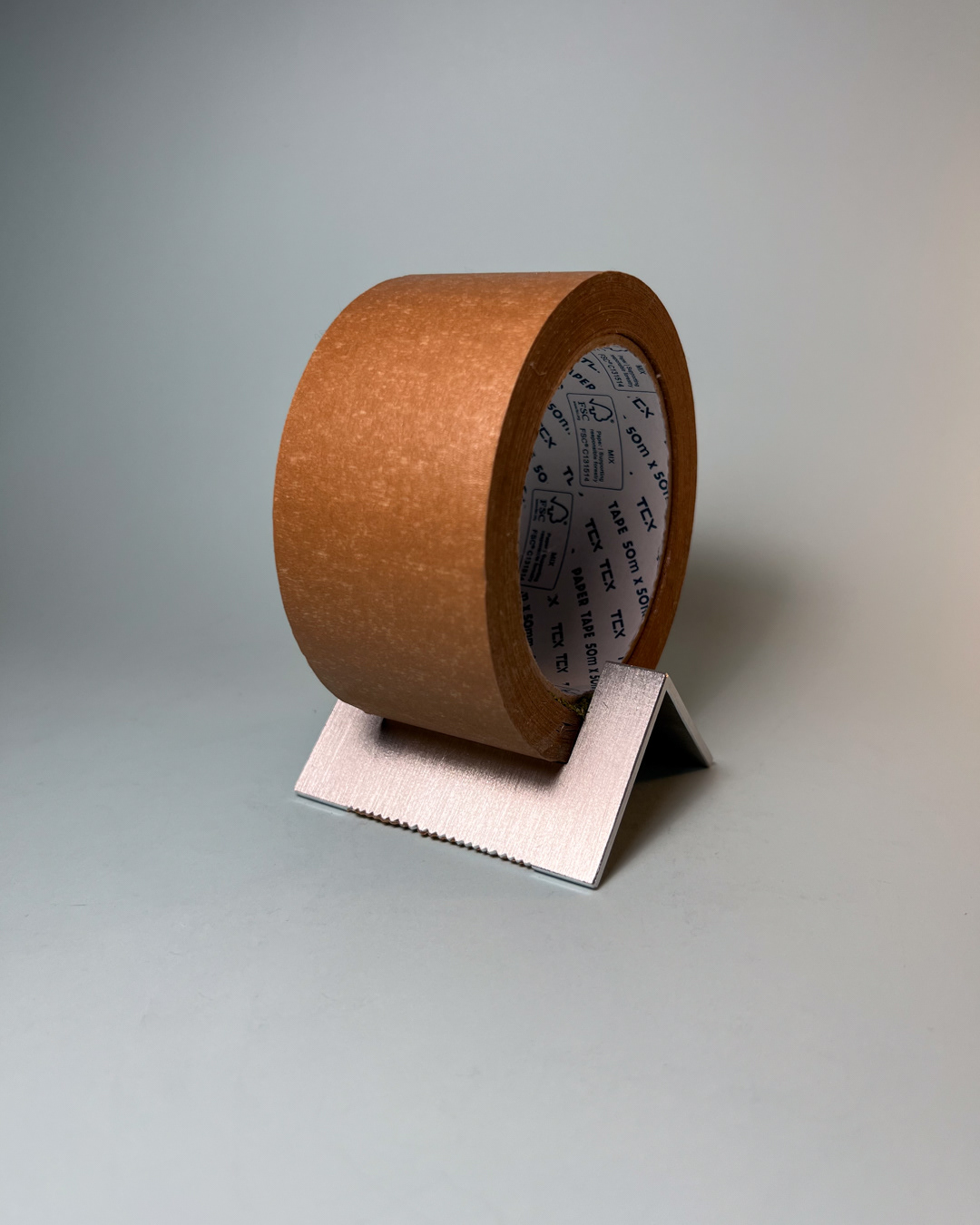 A simple gesture allows the tape to be cut cleanly, guided by a serrated edge shaped by hand, one tooth at a time.