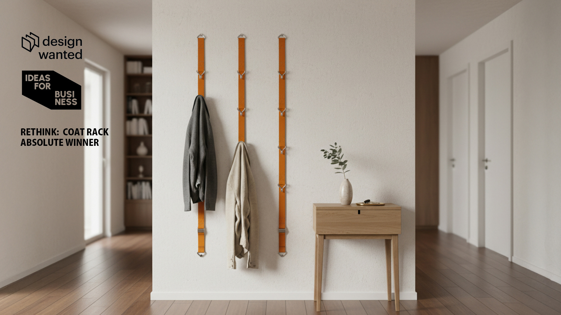 STRAP originates from this observation. The project brings an industrial object into the home, preserving its original logic and components, and reinterprets it as a vertical wall-mounted system for hanging jackets and bags.