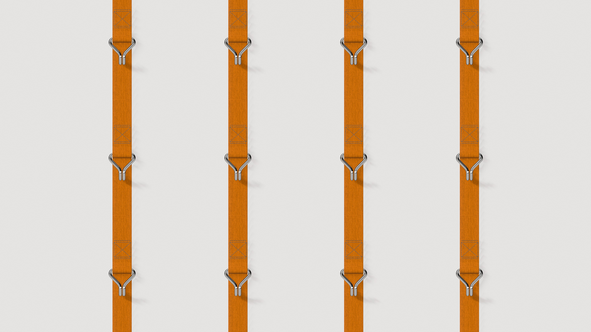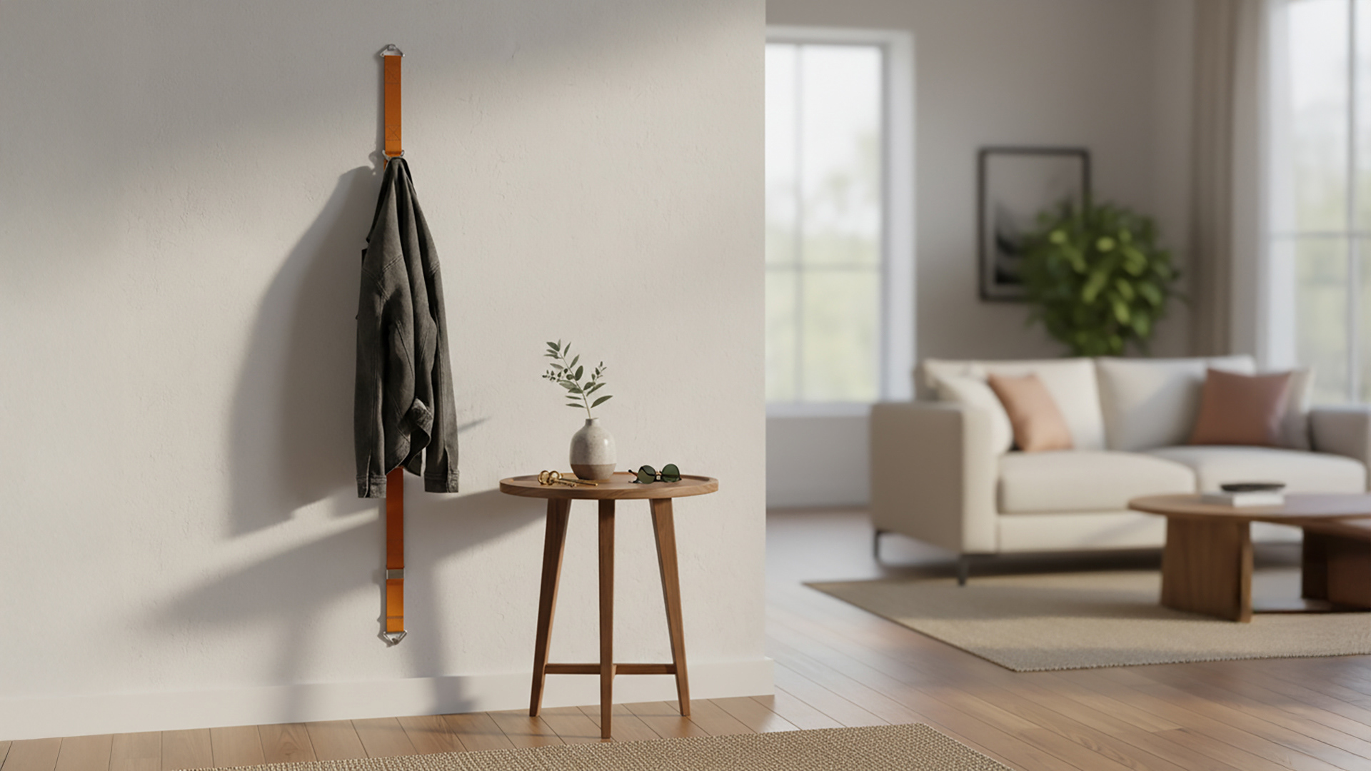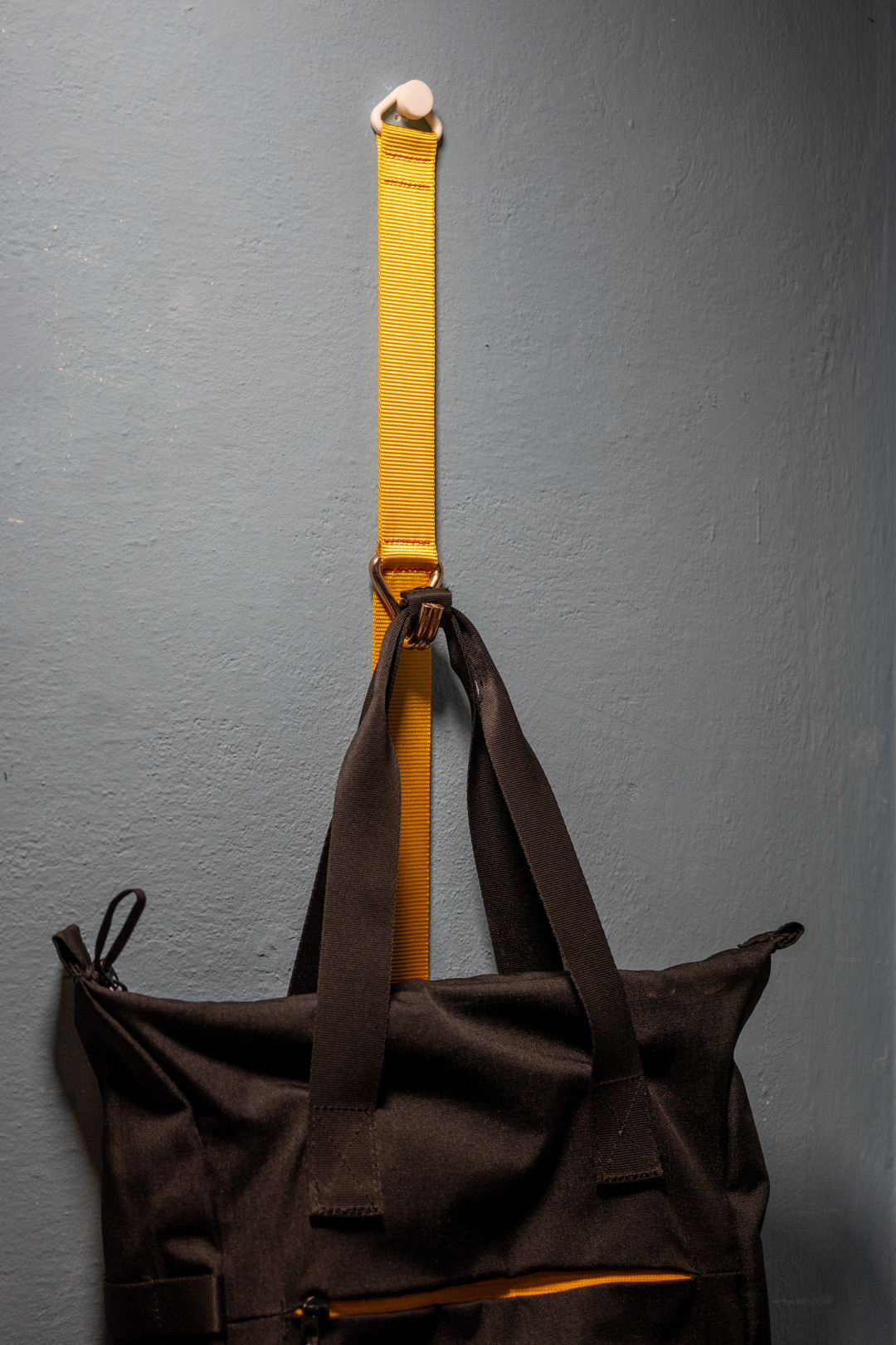 Made from industrial webbing, hooks, buckles, and triangular rings, the system is mounted vertically and kept under tension. Its slim profile and vivid color allow it to occupy minimal space while providing a functional solution for hanging jackets, bags, and everyday accessories in contemporary domestic environments.