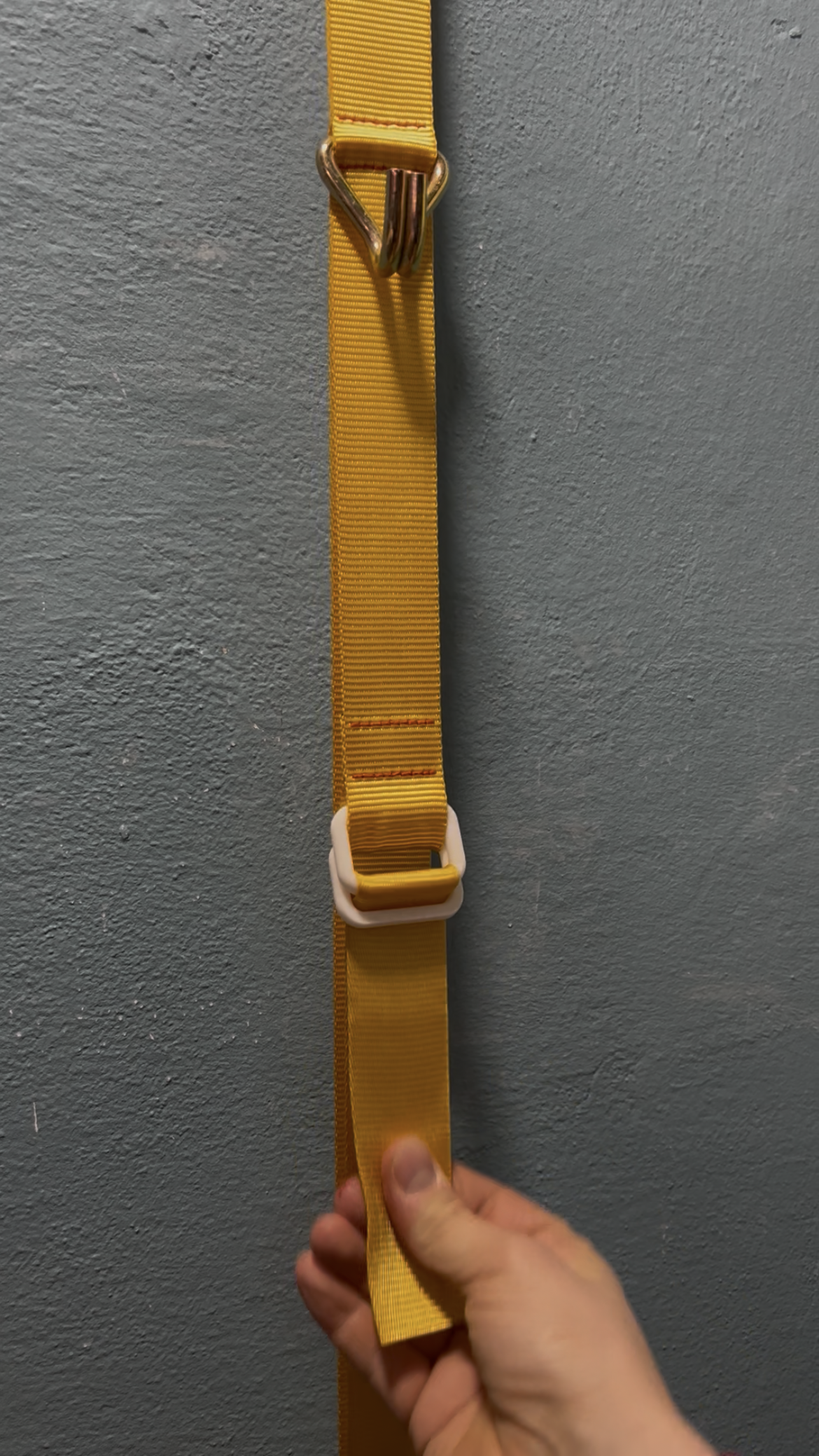 Tension is generated by pulling the free end of the strap downward. The strap wraps around two tensioning rings, where friction maintains the applied tension and secures the system in position.